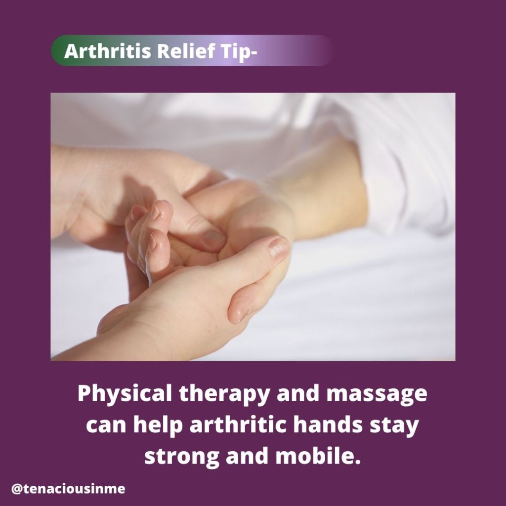 9. Massage- Massage is a great way to relieve many types of pain. Not surprising, it can be helpful in relieving arthritis pain too. While it will not stop joint pain itself, it can help to soothe muscles and tendons that are sore because of the pressure caused by inflamed joints. Massage can release the strain and stress arthritis creates. It can help to both reduce pain and increase mobility.
