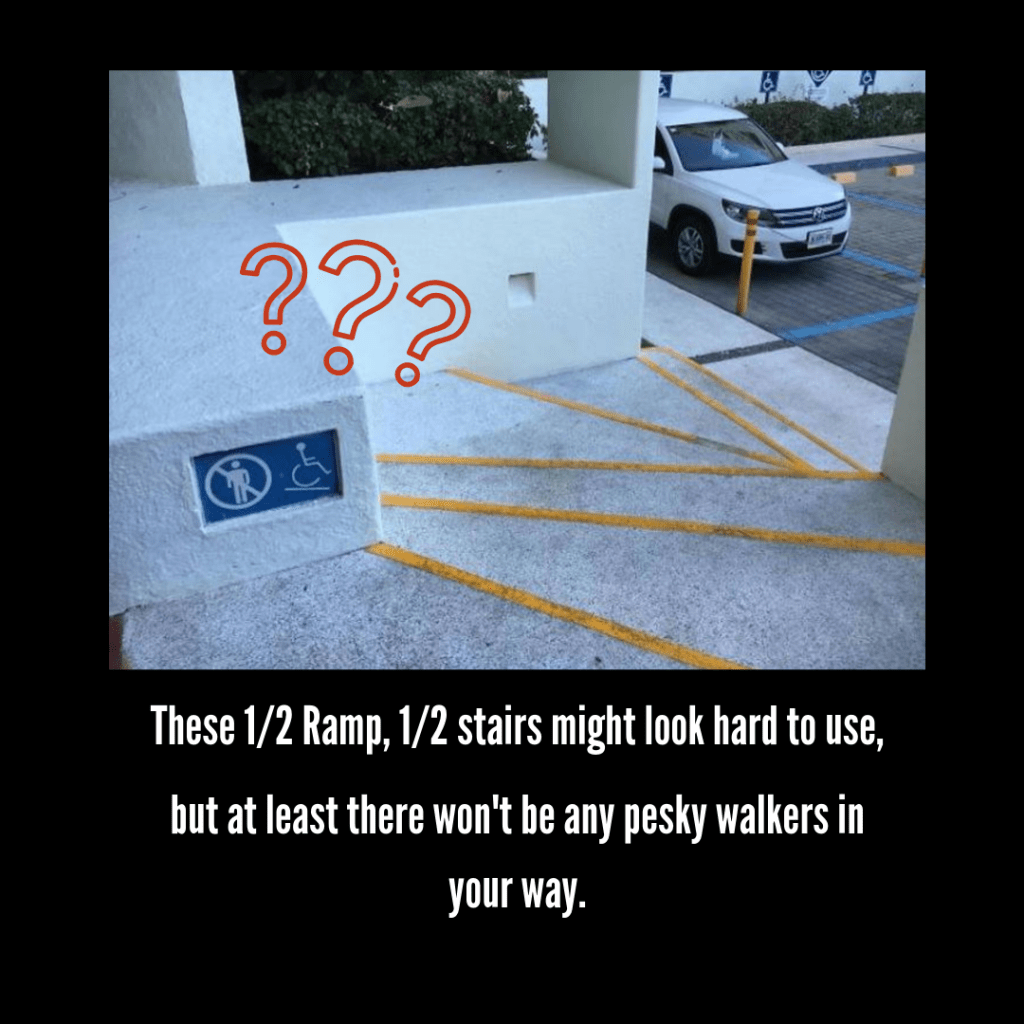 Speaking of crazy, there is nothing filled with much more crazy than handicapped parking. Between people parking where they shouldn’t and spaces that were never really designed for handicapped people (a sign does not create accessibility), we have a really loooong way to go to solve this most common issue. Take a closer look at those spaces, where are they? Some are on the wrong side of the building, with ramps and doors accessible for wheelchair users on the opposite end of the building. Some have lovely concrete barriers between them and the sidewalk. A massive barrier to anyone with wheels or a balance issue. Many more are snugged up next to broken curbs, crumbling medians, and potholes. Minor irritations if you have no physical limitations, dangerous pitfalls if you are mobility challenged.