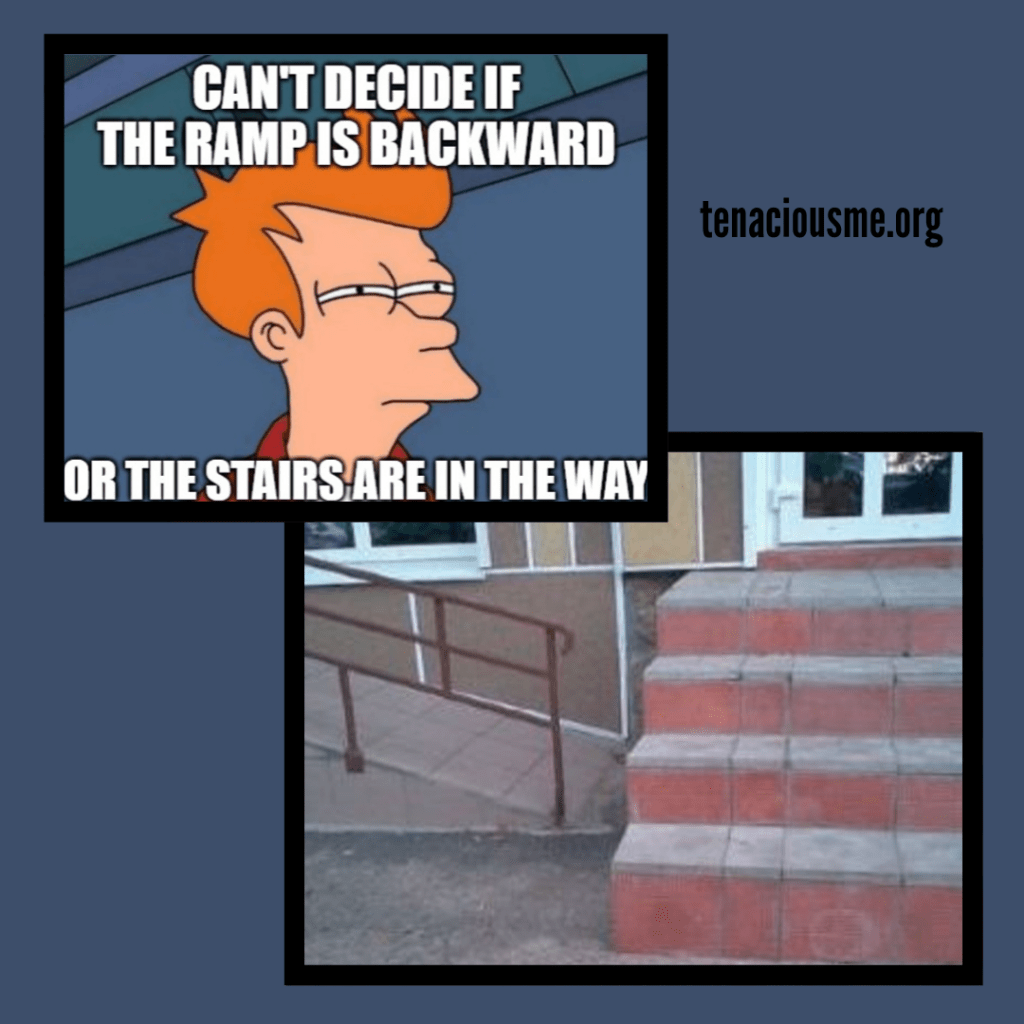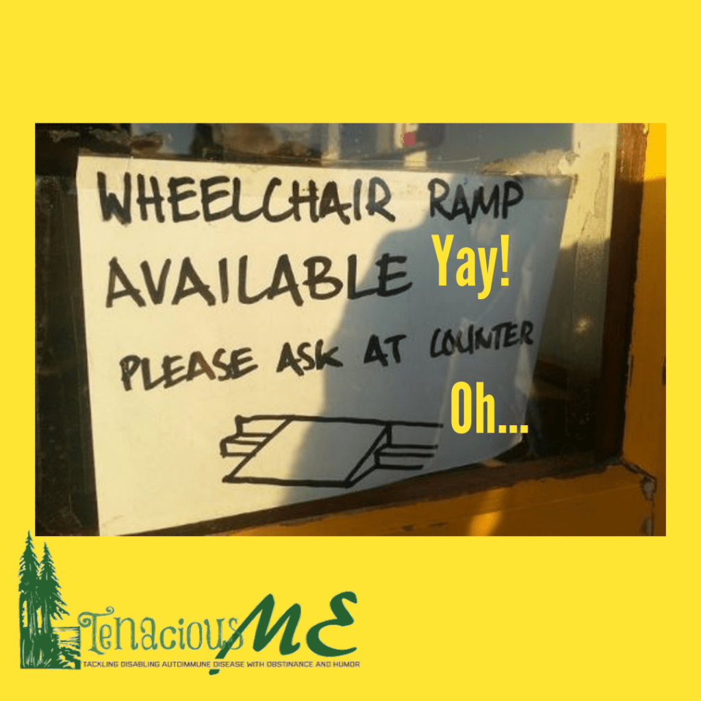 Existence of a ramp doesn’t provide access unless the ramp is safe and accessible. All year. This means not attending to ice at the bottom of your ramp makes it inaccessible. You’d be shocked how many times I’ve had to point that out when I’ve gotten inside an establishment. It’s like people somehow think those in wheelchairs who’ll be using that ramp can’t slip.